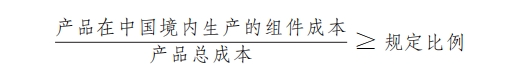 產(chǎn)品在中國(guó)境內(nèi)生產(chǎn)的組件成本占比應(yīng)當(dāng)達(dá)到規(guī)定比例,計(jì)算公式為: